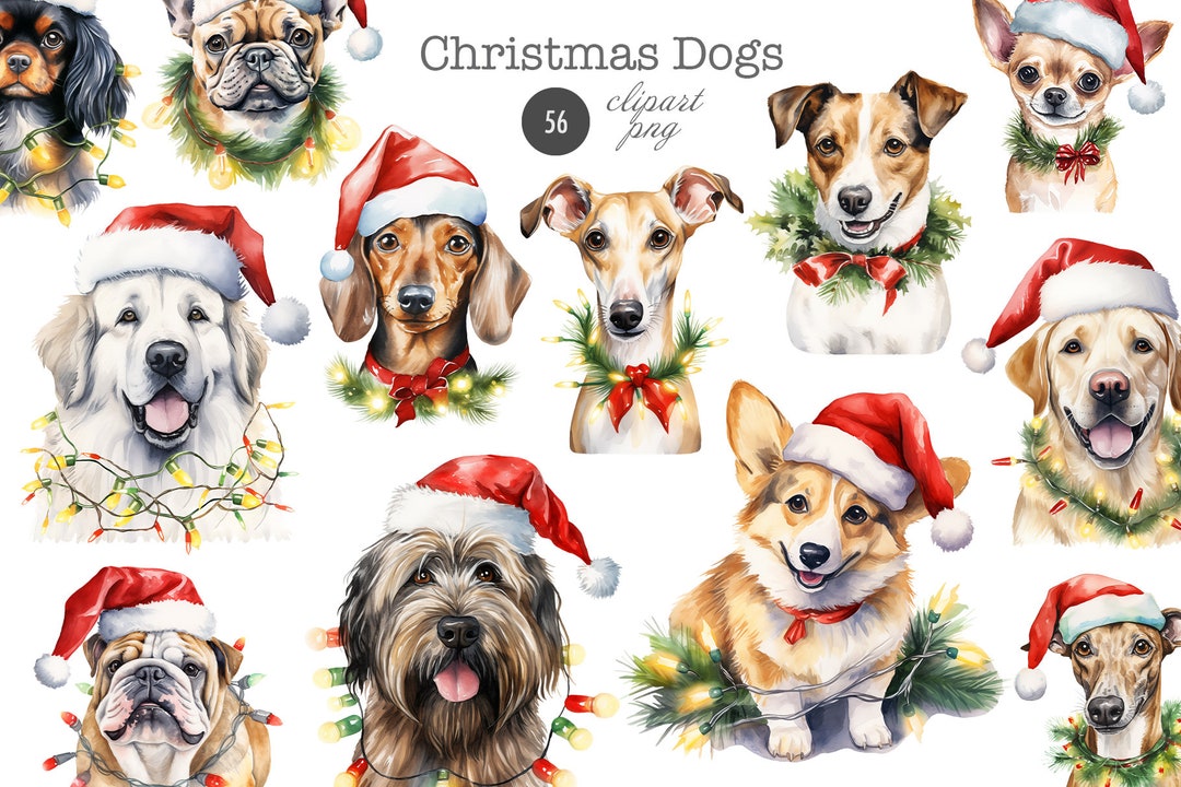 Watercolor Christmas Dog Breed Png clipart Holiday Bundle of 50