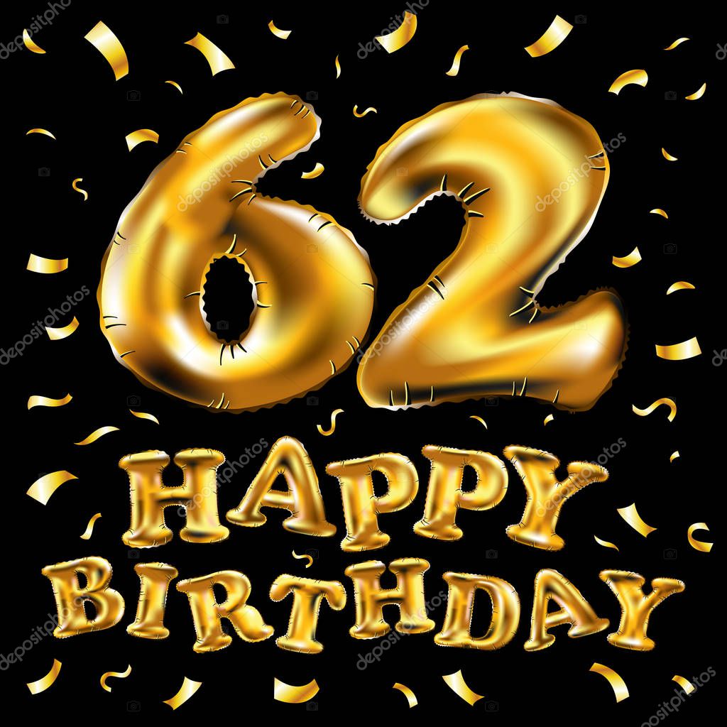 62 Golden number helium balloons isolated background Realistic foil