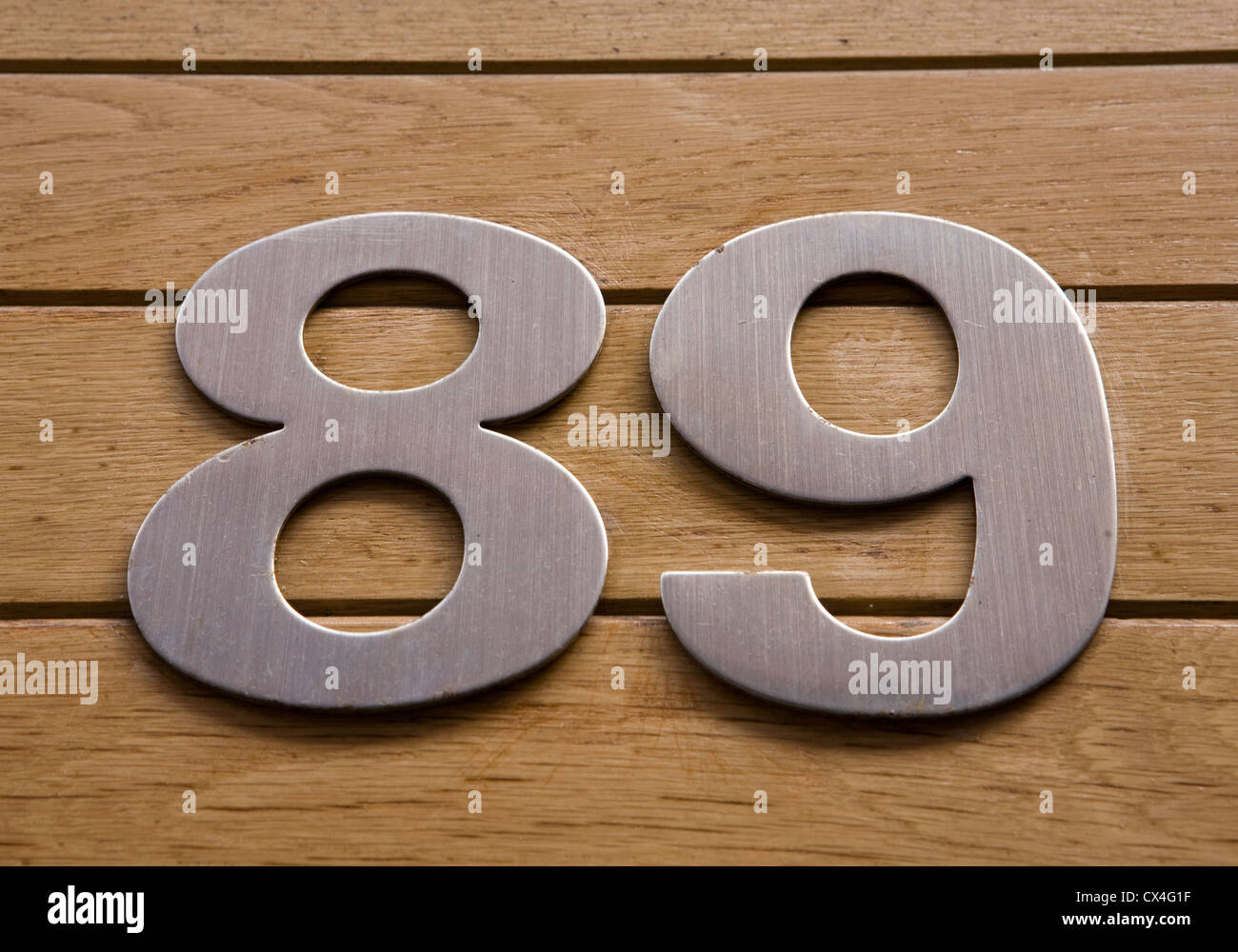 Number 89 eighty nine brushed steel numbers on wooden door Stock Photo